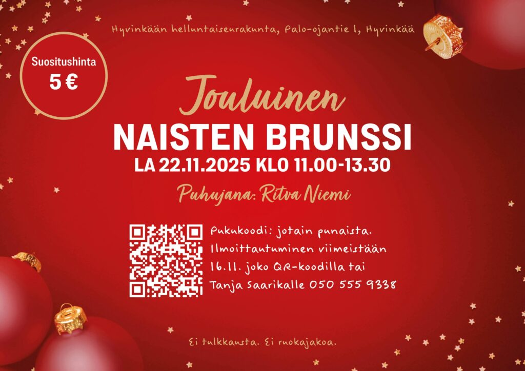 La 22.11. klo 11-13.30 Jouluinen naisten brunssi – Puhujana Ritva Niemi. Pukukoodi: jotain punaista. Ilmoittautuminen viimeistään 16.11. mennessä Tanja Saarikalle, p. 050 555 9338 tai QR-koodilla.
