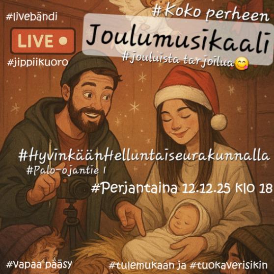 Pe 12.12. klo 18 Joulumusikaali, miltä joulun tapahtumat näyttäisivät, jos ne tapahtuisivat meidän aikanamme? – Esiintyy Jippii-kuoro ja livebändi. Jouluista tarjoilua.